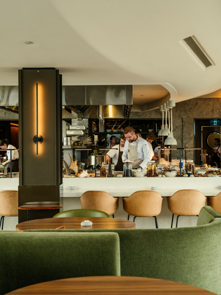 One summer evening, after a tartare of Nova Scotia diver scallop in a rousing sea buckthorn aguachile, a wolf eel made its entrance. A gleaming roulade with a fine edge of burnt umber, it sat within a surreal landscape of coral-like tuiles, curling green shoots, beach peas, and asparagus tips—an arrangement caught between the wild and the composed, evocative of tidepools and garden beds both.